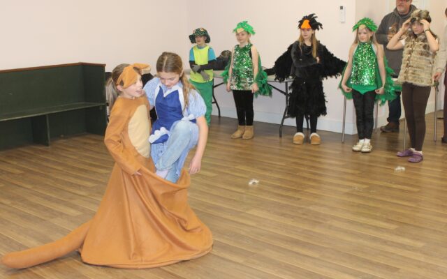 HOP ON IN — Dot, played Paisley Libby, gets in Mrs. Kangaroo’s pouch, played by Addilyn Johnson, as SeDoMoCha Stageworks performs a scene from its production of “Dot and the Kangaroo JR.” for the RSU 68 School Board during a Tuesday evening meeting at the Harland A. Municipal Building in Sebec.