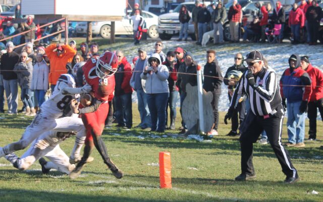 NOT TO BE DENIED — Dexter’s Cameron Paige drags a pair of would-be Mattanawcook Academy tacklers on the way to the winning score via a 5-yard touchdown during the fourth quarter of a 2019 Class D North semifinal. SAD 46 has launched a $250,000 field lighting project.