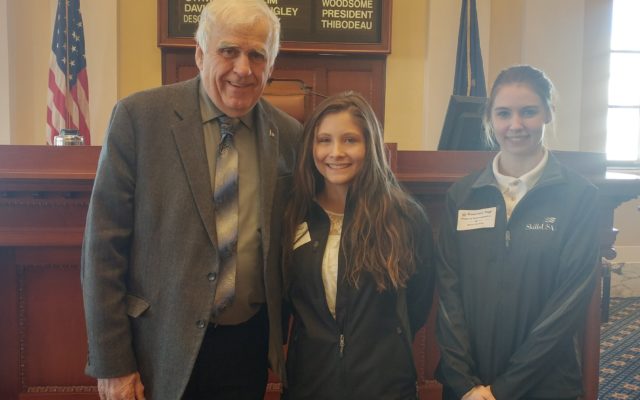 SEN DAVIS MEETS SKILLSUSA GOLD MEDALISTS -- Makayla McKenzie, center, and Briana Spaulding, both of Dexter, visited the Statehouse for SkillsUSA Championship Day on April 9. The two are gold medal winners from the Tri-County Technical Center in Dexter. McKenzie won in commercial banking and Spaulding won gold in advertising design. During their day in Augusta the pair were congratulated by their Sen. Paul Davis, R-Sangerville.
