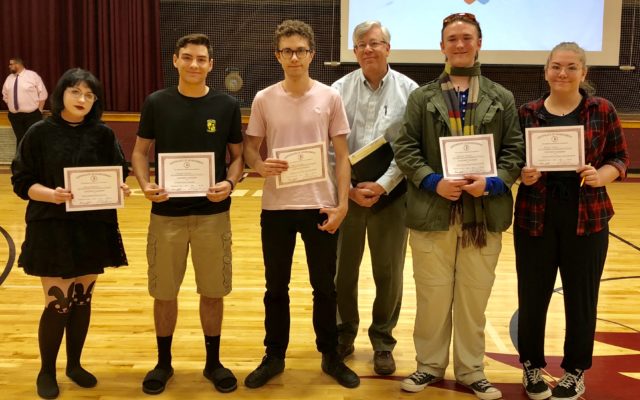 FOXCROFT ACADEMY HORIZON SCHOLARS — Three current Foxcroft Academy students and two future students (currently attending SeDoMoCha Middle School) were presented Horizon Scholarships by Tom Lizotte of the Foxcroft Academy Board of Trustees at a May 9 assembly for financial support to take part in exceptional academic experiences not presently offered at the school. From left are Chloe Hamele, Jacob Ireland, Mark Kilmer, Lizotte, Connor Plante and Diana Voter.