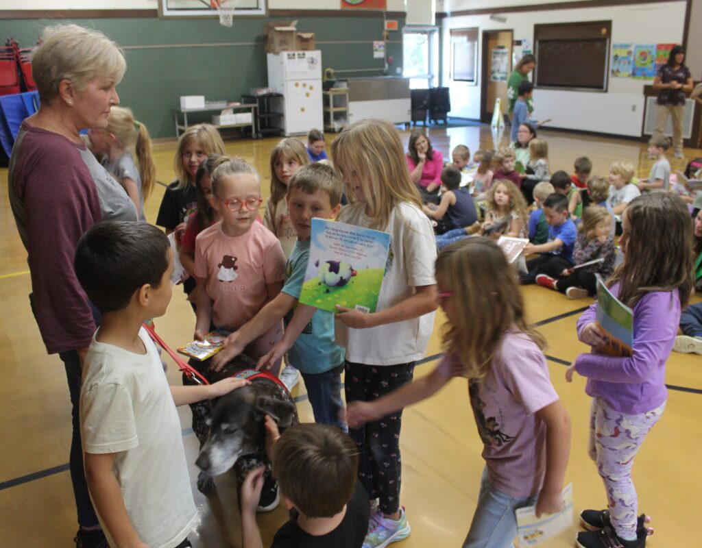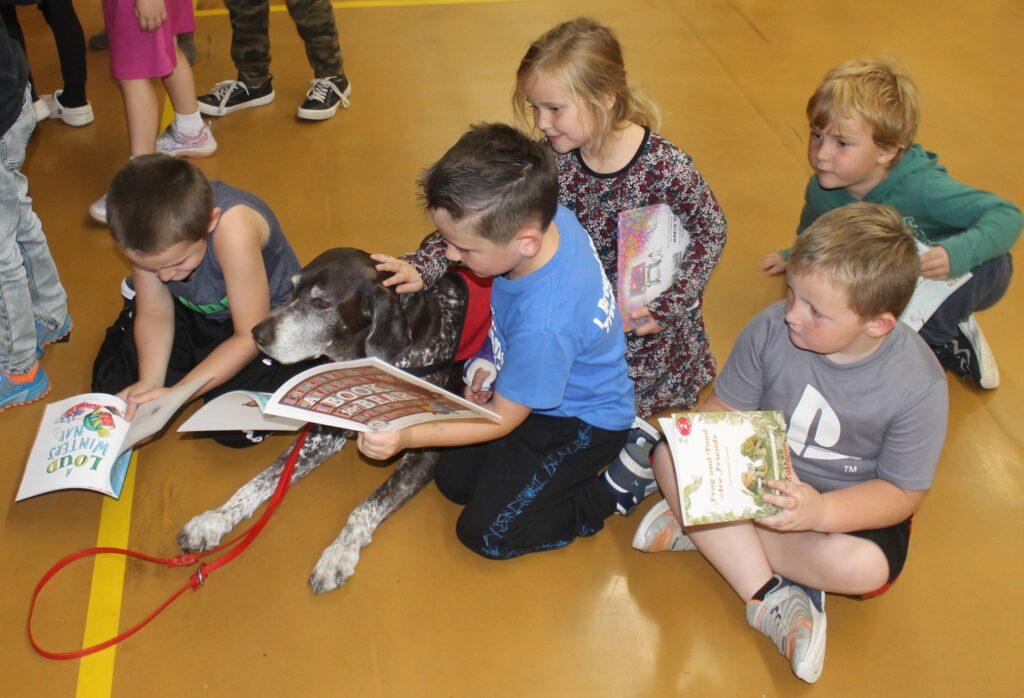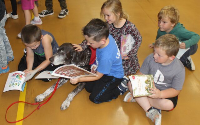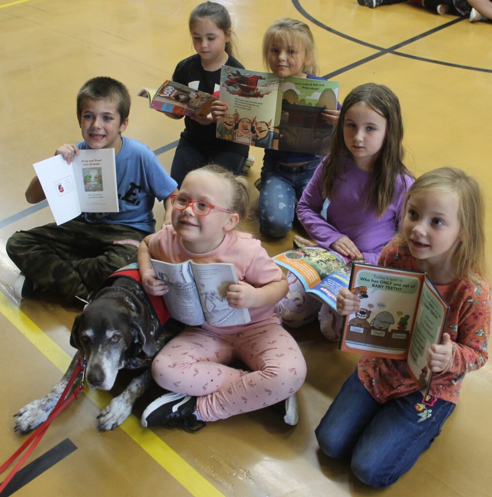 PETS FOR ERMA — Milo Elementary students pet Erma the READing Dog and talk about their newly gifted books with Erma’s handler April Taylor.