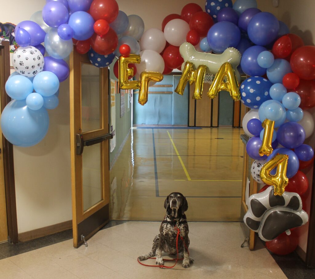 The German Shorthaired Pointer recently turned 14 — having been an Alliance of Therapy dog for 13 years as well as a READing dog — and Erma and her handler READing with Erma Founder April Taylor celebrated the birthday at Milo Elementary on Oct. 2.