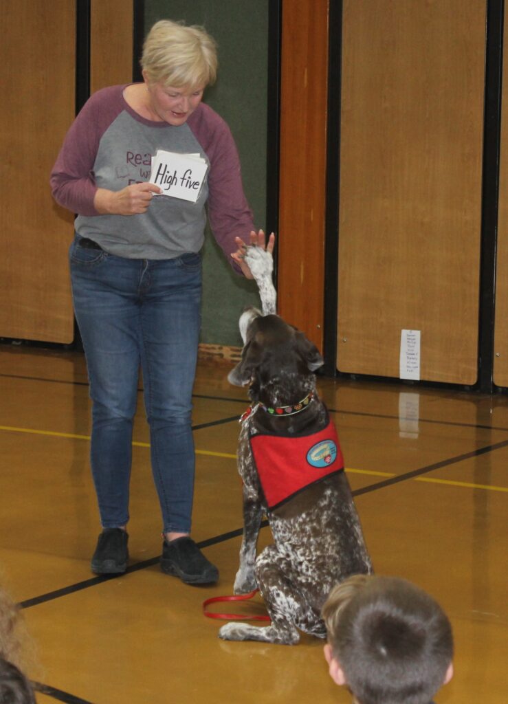 HIGH FIVE — Erma the READing Dog shows her handler what the high five cue says during a demonstration for Milo Elementary students on Oct. 2.