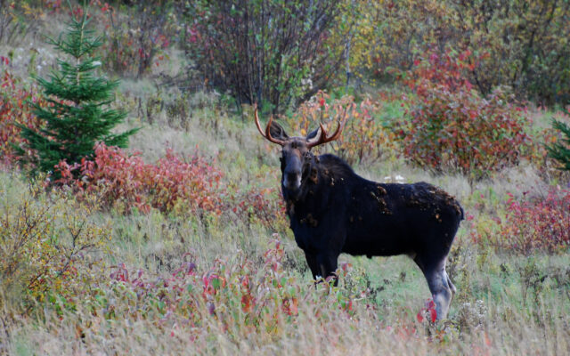 BULL MOOSE — This fine bull moose is covered with burdocks after plowing through the woods and brush to investigate cow calls. During hunts, using a moose call is very productive.