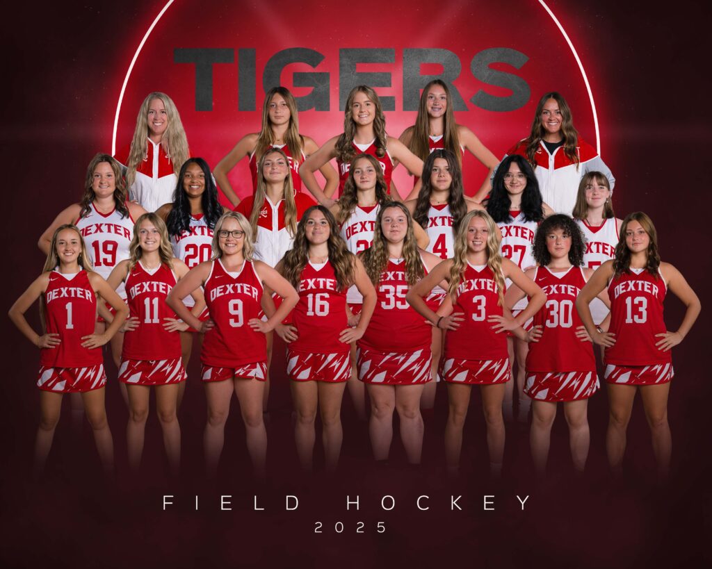 DEXTER FIELD HOCKEY — Front, from left, Shelby Sinclair, Mellesse Grant, Makenzie Curtis, Olyvia Watson, Cynthia Adams, Maddisyn Davis, Jamie Neptune-Williams and Lily Wintle. Middle, Kallie Stone, Ella-Marie Buschmann, Isabella Wallace, Abagail Trafton, Genevieve Rich, Danica Derocco and Chloe Murdock. Back, coach Kacie Ponti, Hannah Derosier, Aubrey Ladd, Kaitlyn Cookson and head coach Peyton Watson. Not pictured, managers Lexi Wintle and Laney Scott.
