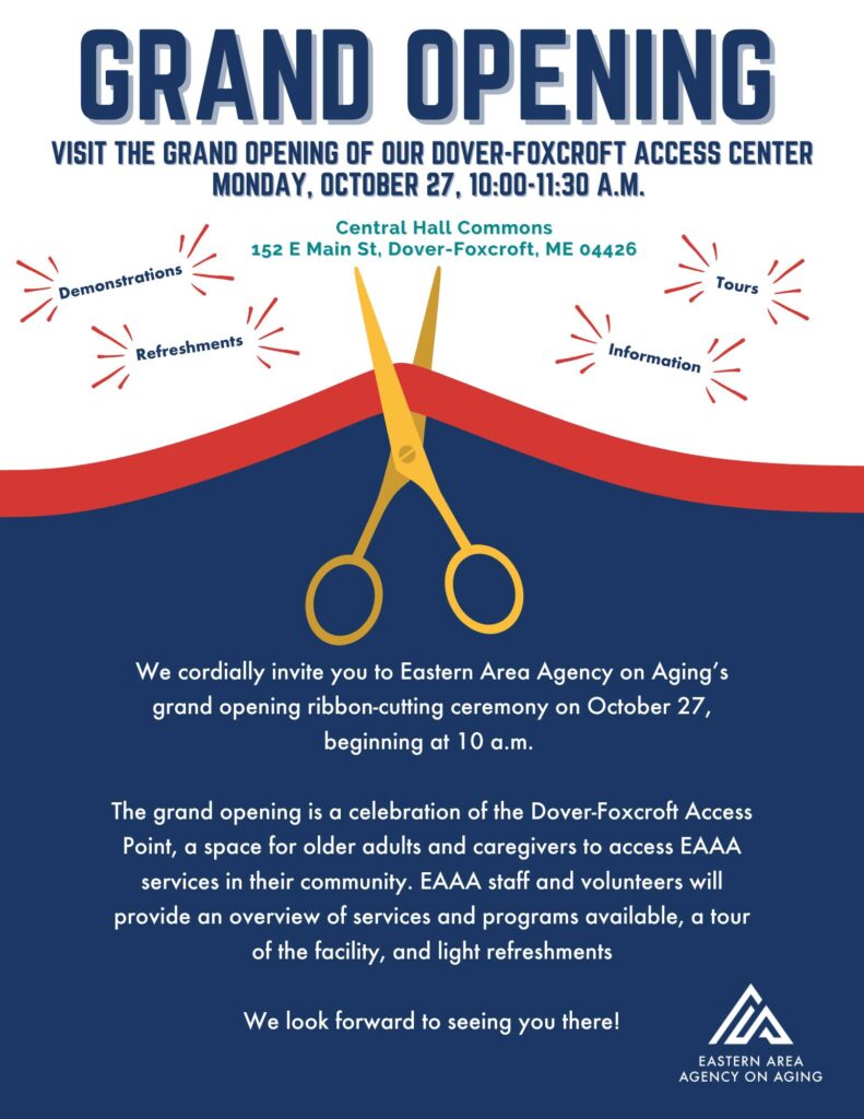 DOVER-FOXCROFT — The Eastern Area Agency on Aging, which serves Penobscot, Piscataquis, Washington and Hancock counties, will host a grand opening and ribbon-cutting ceremony on Monday, Oct. 27 from 10 a.m. to noon at its new Access Center, located within Central Hall Commons.