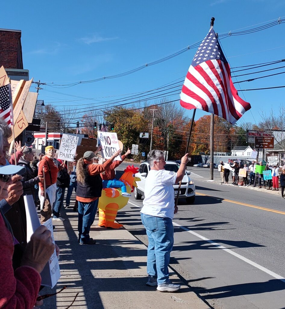 DOVER-FOXCROFT — One hundred fifty concerned citizens gathered on the East Main Street bridge in Dover-Foxcroft on Saturday, Oct. 18 for a No Kings rally. They joined over 45,000 other Mainers who demonstrated across Maine from Presque Isle to York representing a variety of political parties.