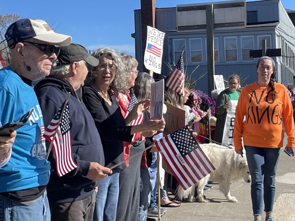 NO KINGS — Local citizens gather on the East Main Street bridge in Dover-Foxcroft at the No Kings demonstration on Oct. 18.