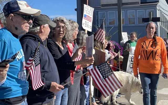 DEMONSTRATION — Deb Dagnon of Dover-Foxcroft waves the American flag at the No Kings demonstration in Dover-Foxcroft as other demonstrators display signs.