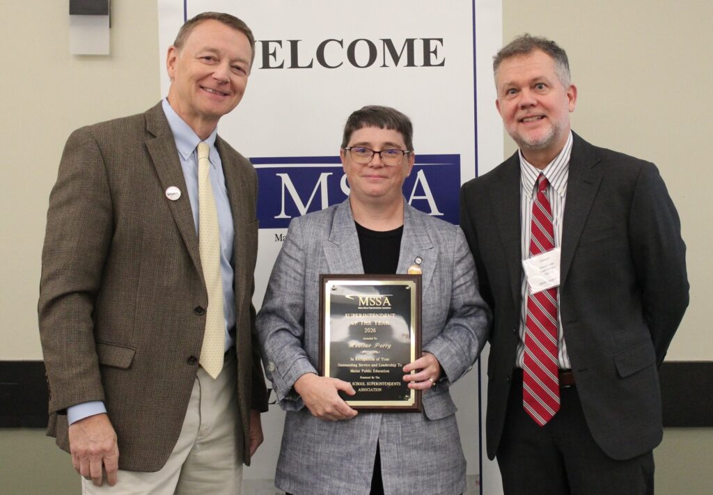 SUPERINTENDENT OF THE YEAR — MSSA President Andrew Dolloff, left, and 2025 Maine Superintendent of the Year Howard Tuttle present Gorham Superintendent Heather Perry with the MSSA 2026 Maine Superintendent of the Year Award. Perry is a former superintendent of Union 60 in Greenville.