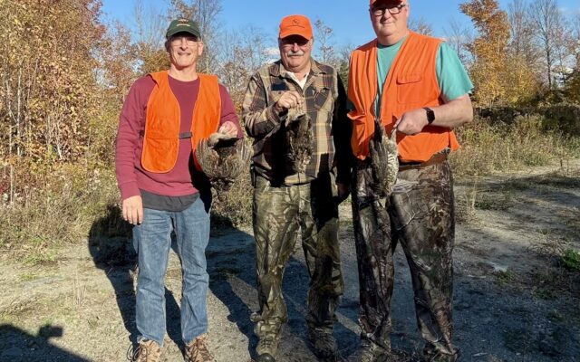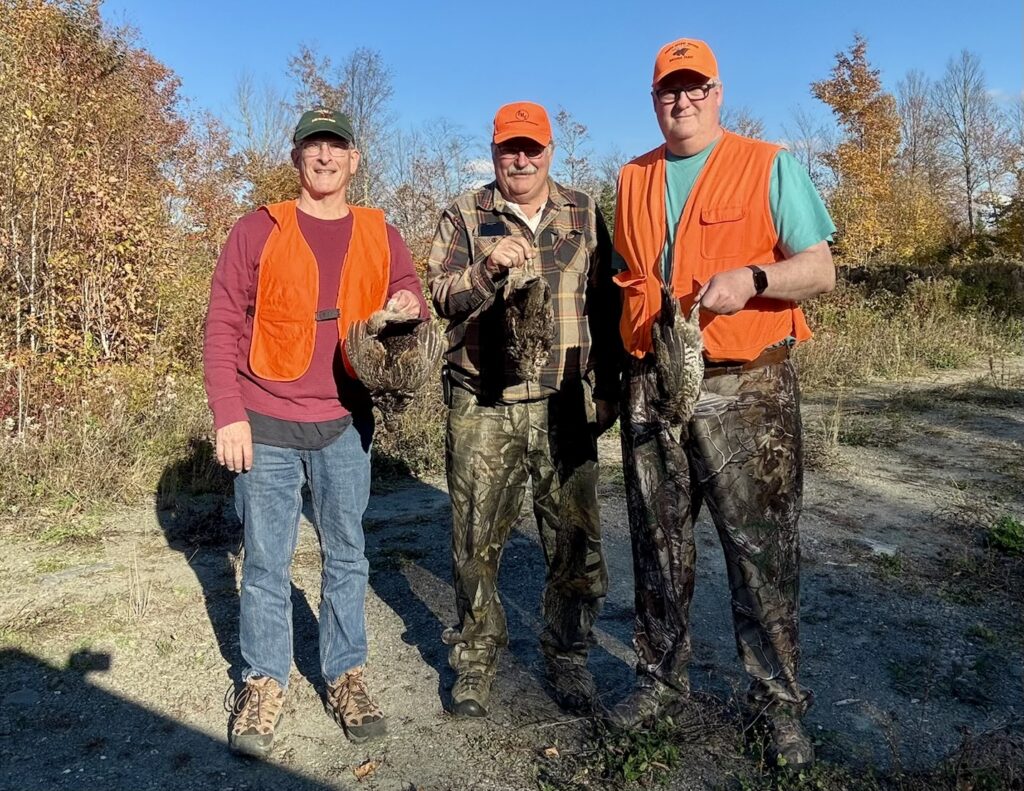 GROUSE HUNTING — From left, Pete Warner, Bill Lander and Chris Lander show the results of a productive drive down a road in the North Maine Woods.