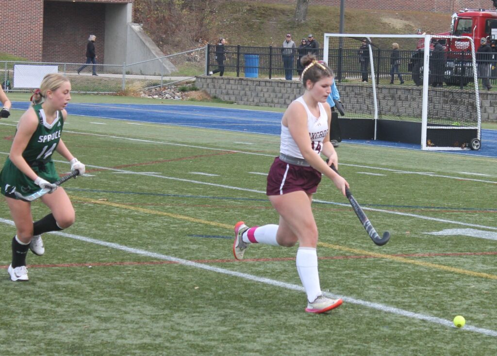 ALL-STATE — Foxcroft Academy senior Jaiyde True gets to the ball ahead of Spruce Mountain sophomore Alaina Kachnovich during the Class C championship in Lewiston. True is one of four players from the area named to the Maine Field Hockey Association All-State team.