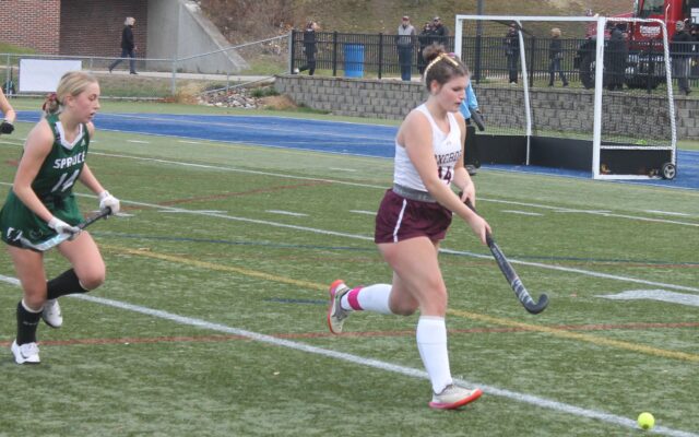 ALL-STATE — Foxcroft Academy senior Jaiyde True gets to the ball ahead of Spruce Mountain sophomore Alaina Kachnovich during the Class C championship in Lewiston. True is one of four players from the area named to the Maine Field Hockey Association All-State team.