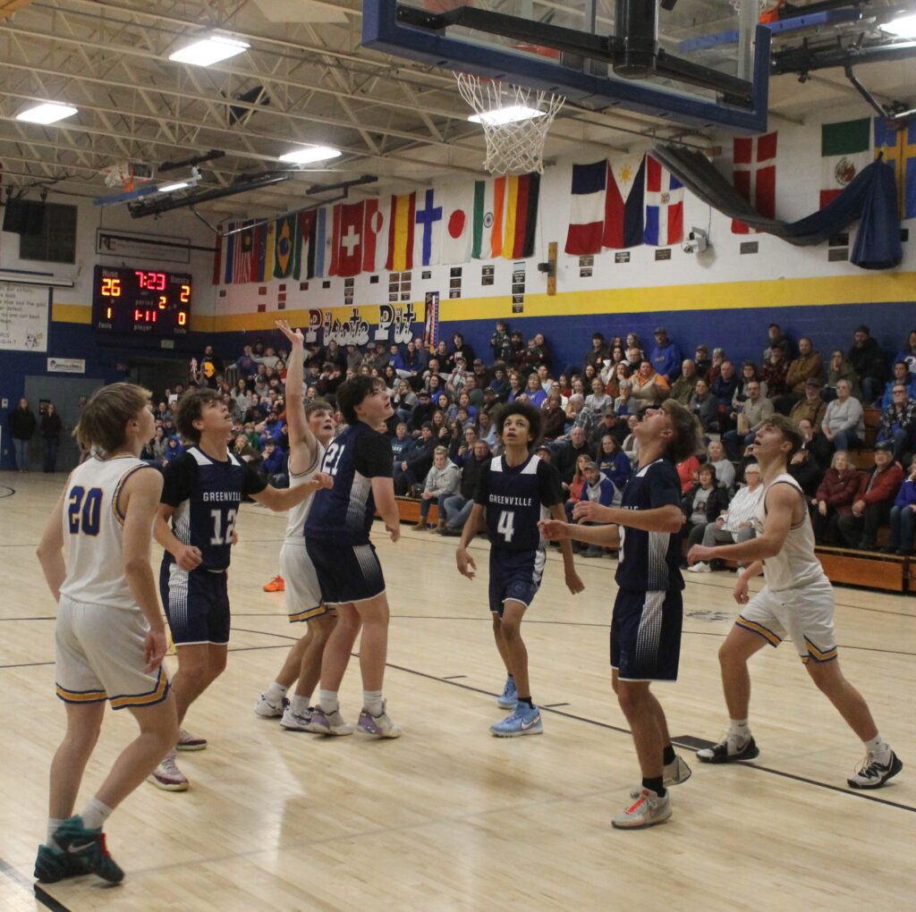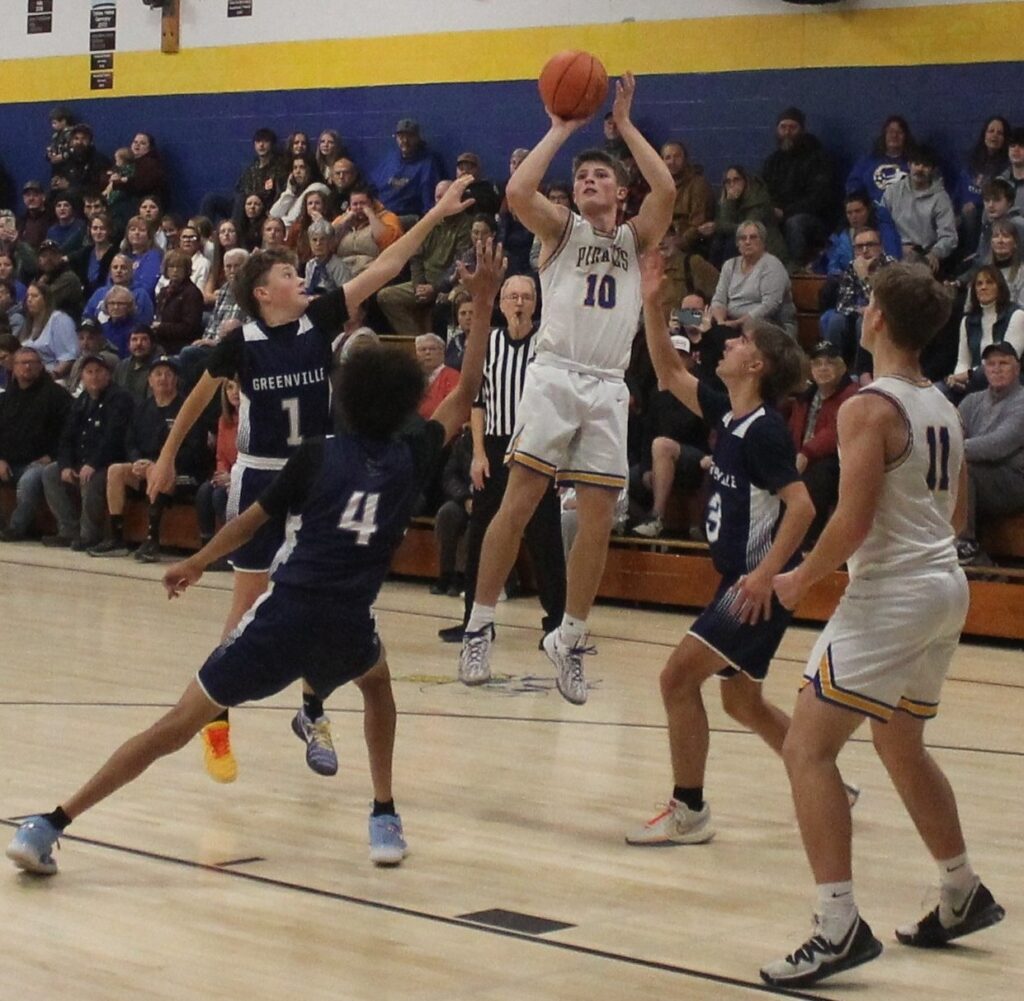 SHOOTING TOUCH — Brady Gaw shoots over a trio of Greenville players during a mutual 2025-26 opener on Dec. 5. The Pirates won 76-29 with Gaw scoring 18 points, including the 1,000th of his career.
