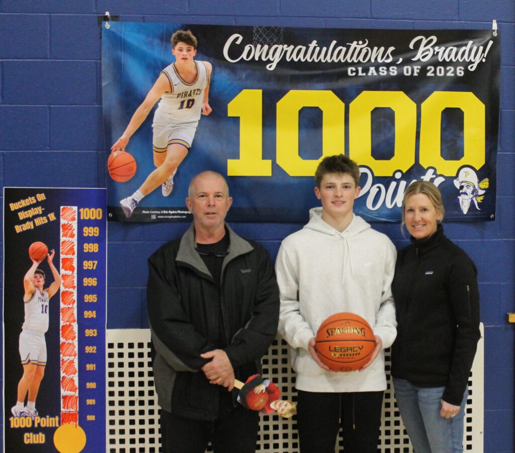 PROUD PARENTS — Brady Gaw poses with his parents Brian and Rebecca after the game in which he scored his 1,000th career point.