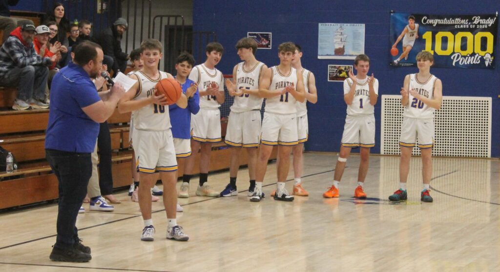 1,000 POINTS — PCHS senior Brady Gaw holds the ball he used to reach the 1,000-point milestone during the second quarter of the season opener against Greenville on Dec. 5. Play was stopped for a brief ceremony with remarks by Athletic Director Tom Panciera. Gaw is the seventh PCHS player to score 1,000 points.