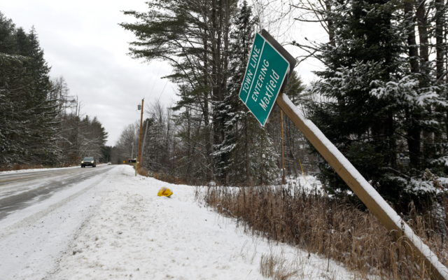 The green town entrance sign on Maxfield Road is also in disrepair, leaning at a 45-degree angle.