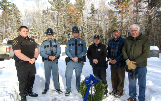 WREATH CEREMONY — Law enforcement officers gathered at the Hillside Cemetery in Monson as part of a statewide wreath-laying ceremony for all troopers who died in the line of duty. Monson native and Trooper Frank Wing was killed in a motorcycle accident in Millinocket on Aug. 19, 1928. Several community members were in attendance as well as Rick Wing who played taps in honor of his relative. After the ceremony there were refreshments offered at the Monson Museum by members of the historical society. From left, Penobscot Corrections Officer Eric Bennett, Trooper Anthony Mareglia Trooper Sgt. Taylor Dube, Trooper Cpl. Marc Poulin, retired Trooper David Preble and retired Trooper Paul Davis.