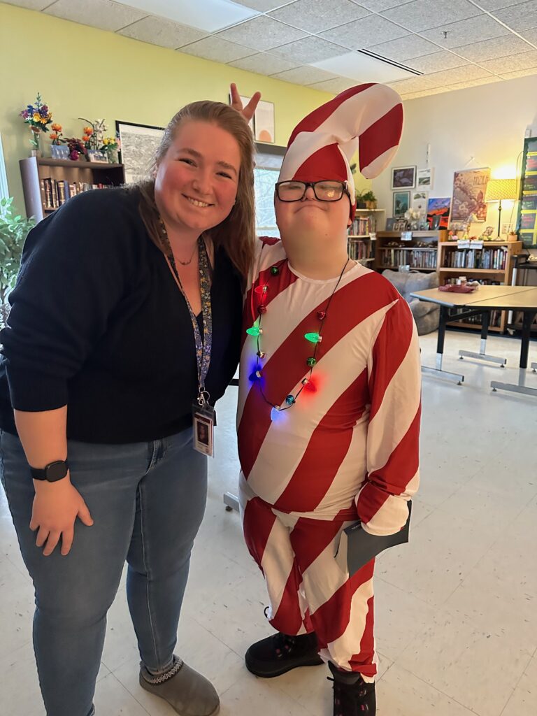 CANDY CANE ATTIRE — The SeDoMoCha School in Dover-Foxcroft recently had a “Candy Cane” day where students were encouraged to wear red and white. Here, eighth-grader Charlie Johnston, shows his homeroom teacher Gabby Jolin his candy cane outfit.