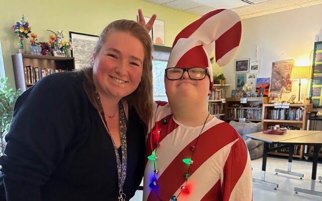 CANDY CANE ATTIRE — The SeDoMoCha School in Dover-Foxcroft recently had a “Candy Cane” day where students were encouraged to wear red and white. Here, eighth-grader Charlie Johnston, shows his homeroom teacher Gabby Jolin his candy cane outfit.