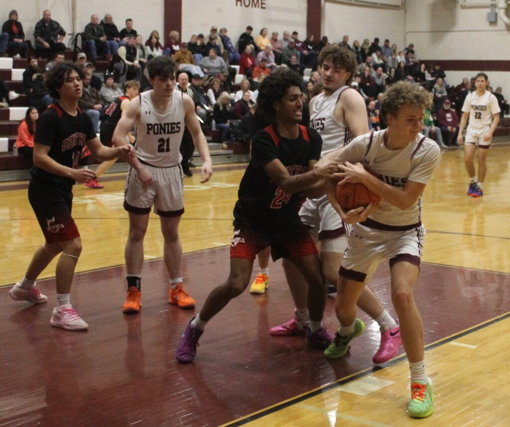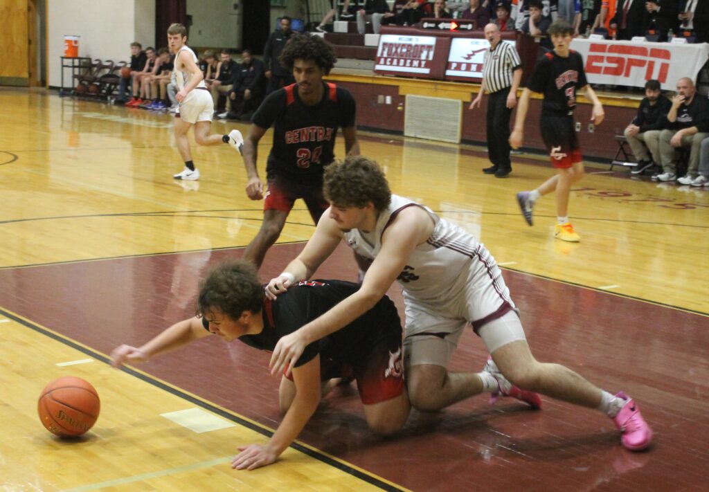 LOOSE BALL — Pony junior Hunter Stevens and Central junior Alex Withee go for a ball rolling on the court during the fourth quarter. Stevens had 10 points for the Ponies.