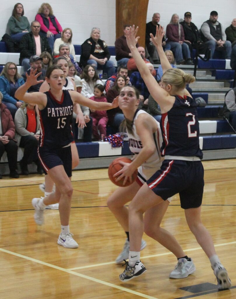 SMALL WINDOW — Junior Ashley Ladd looks to get off over the reach of Bangor Christian sophomore Moriah Emerson (2) and freshman Maris Kowalski (15).