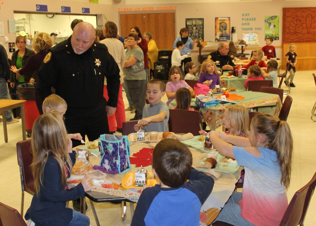 LUNCH WITH THE SHERIFF — Piscataquis County Sheriff Bob Young chats with Piscataquis Community Elementary School kindergarteners during a Thanksgiving lunch in 2019. Young has announced that he will not seek reelection when his term expires at the end of 2026 after eight years as sheriff and decades in law enforcement.