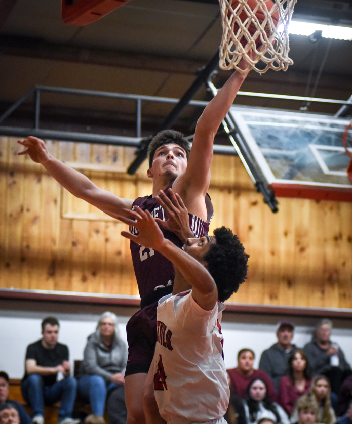 ROAD VICTORY — Foxcroft Academy’s Lucas Sands goes up for a shot over Central’s Aiden Gregory in second half action of a game at Central High School on Jan. 15. Foxcroft won 72-49.