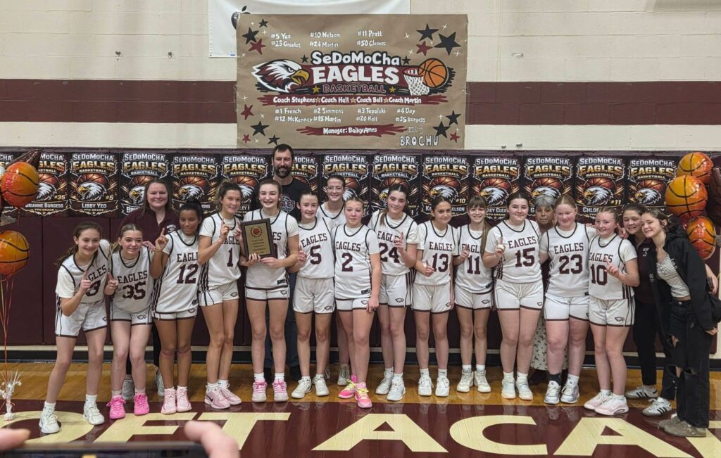 LARGE SCHOOL CHAMPS — The SeDoMoCha Middle School girls won the 2026 Penquis League Large School championship on Jan. 17 at Foxcroft Academy. The top-seeded Eagles defeated No. 2 Mattanawcook Junior High School of Lincoln 50-33. Front, from left, players Gabby Topolski, Brianne Burgess, Kennedy McKenney, Lilah French, Kinsley Hall, Libby Yeo, Audrey Cleaves, Kelsey Simmons, Sariah Martin, Glenna Brochu, Chloe Pratt, Eizley Martin, Brynn Gaudett, Kaydiense Nelson and manager Bailey Adams. Back, coaches Jessica Bell, Brandon Hall, Diane Stephen and Elizabeth Martin.