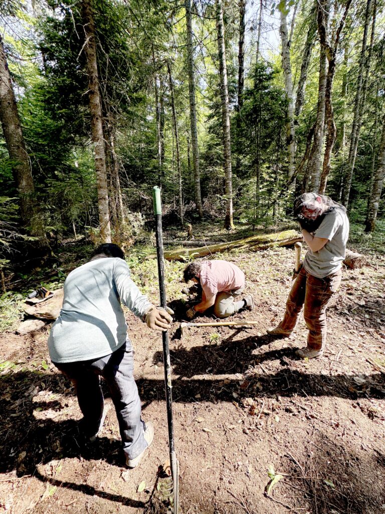 LEVELING — Staff and volunteers with the Northern Forest Canoe Trail level ground at the East Twin Brook campsite in the Allagash, prepping the space for a new tent pad with improved drainage.