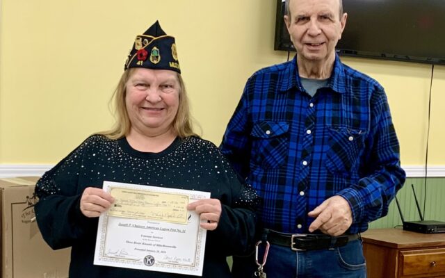 LEGION CONTRIBTION — Eve Powell of American Legion Post #41 accepts a $500 donation from Three Rivers Kiwanis President Joe Duarte, with funds coming from the Kiwanis’ 8-Ball Pool League.