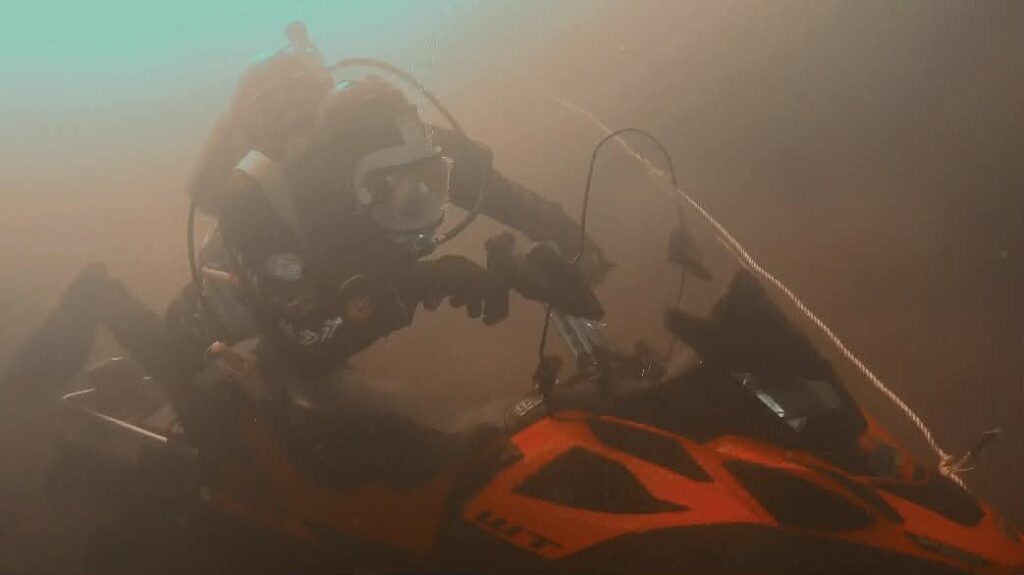 At one point during the recovery, Canders had some fun pretending to ride the sled wide open and jokingly pulled the snowmobile’s starter cord while it was still underwater.
