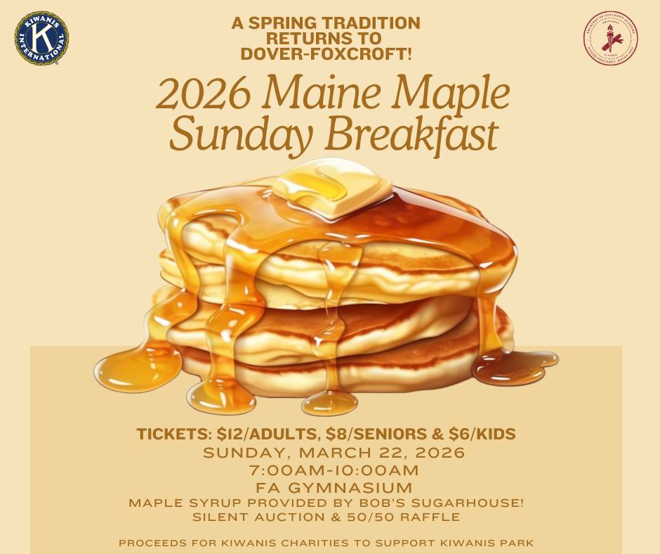 DOVER-FOXCROFT: The 2026 Maine Maple Sunday pancake breakfast returns from 7-10 a.m. at Foxcroft Academy, also hosted by the Dover-Foxcroft Kiwanis. There will be a silent auction and a 50/50 raffle to benefit the Kiwanis Club.