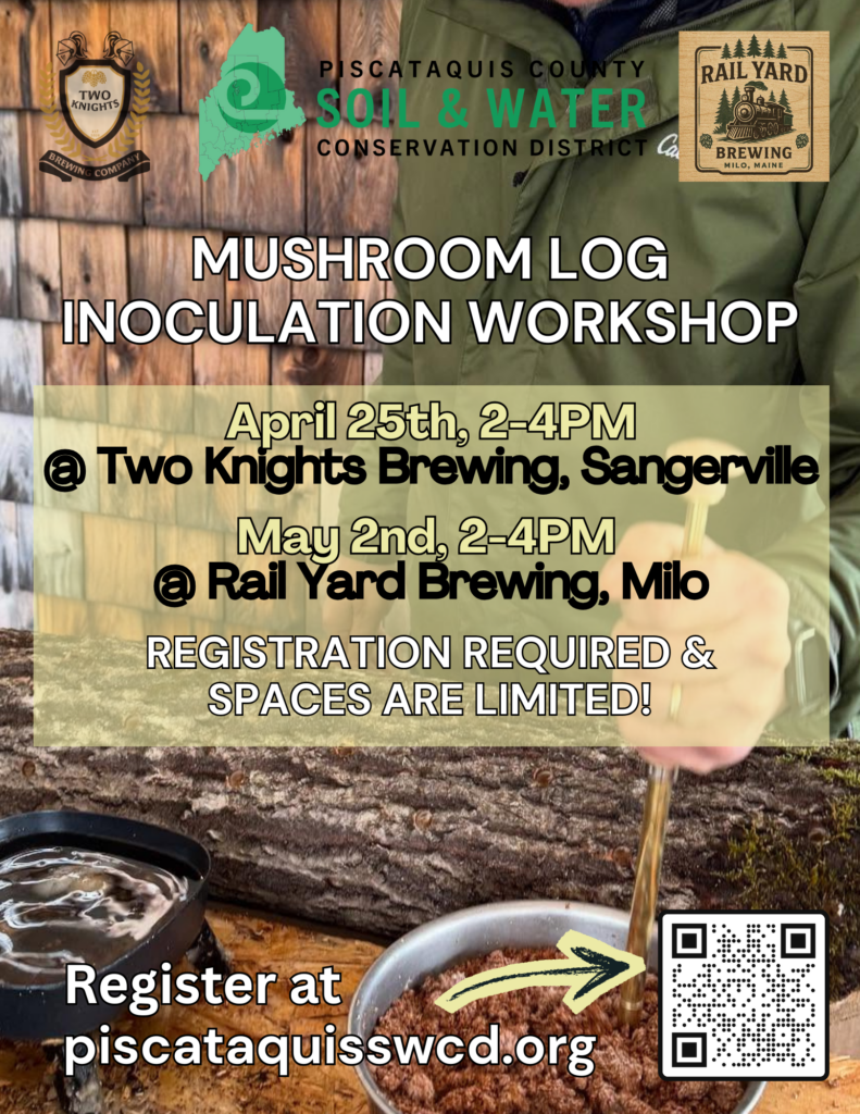 Piscataquis County Soil and Water Conservation District is gearing up to present two Mushroom Log Inoculation Workshops, one on April 25 at Two Knights Brewery, Sangerville and a second on May 2 at the Railyard Brewery in Milo.