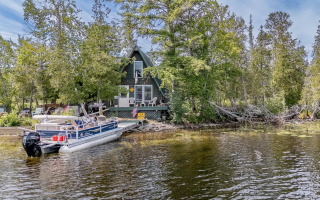 The two-bedroom, one-bathroom seasonal camp comes mostly furnished, including everything from a dock to kitchenware to linens. The cabin includes 435 square feet of living space, and has one bedroom on the first floor and a loft space big enough to comfortably sleep up to six people.