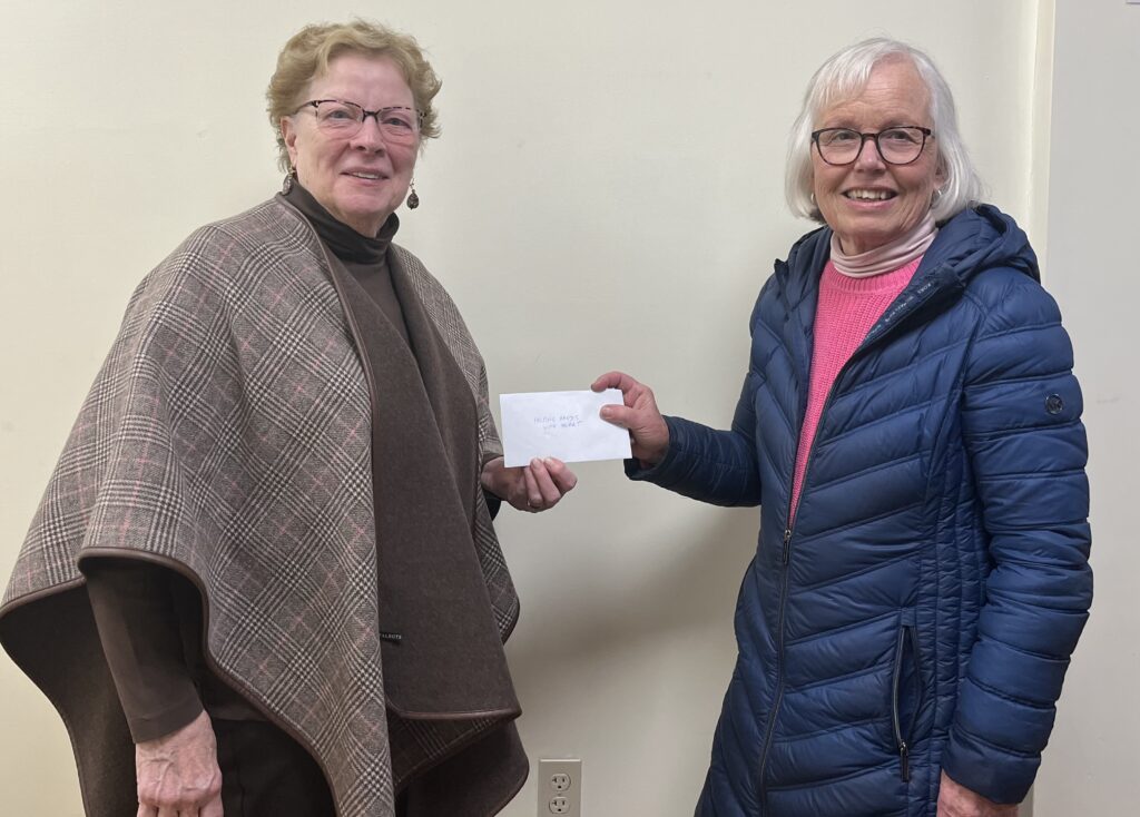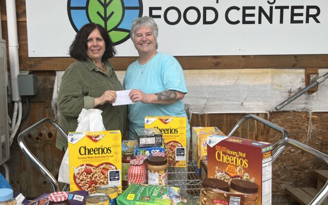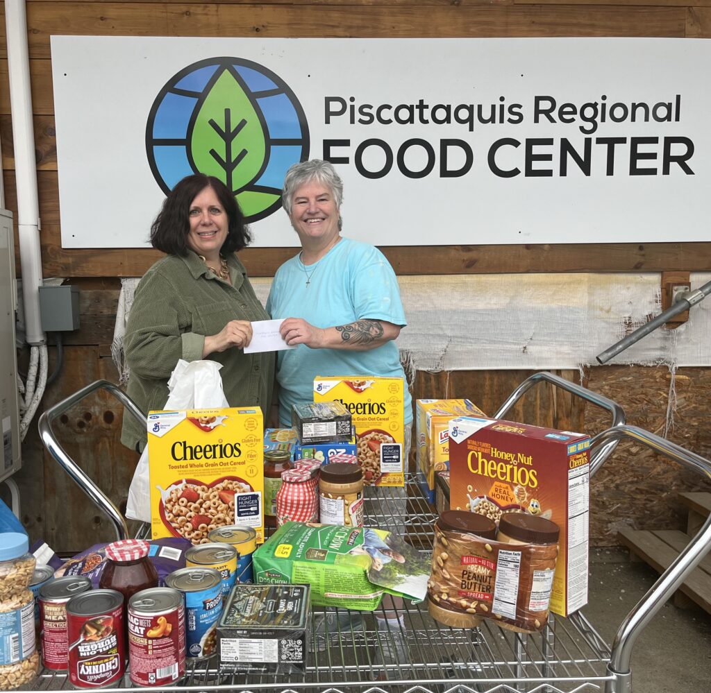 DONATION —- Kelly Sirimoglu, left executive director of the Piscataquis Regional Food Center, with Deb Dagnan, chair of Piscataquis County Democrats.