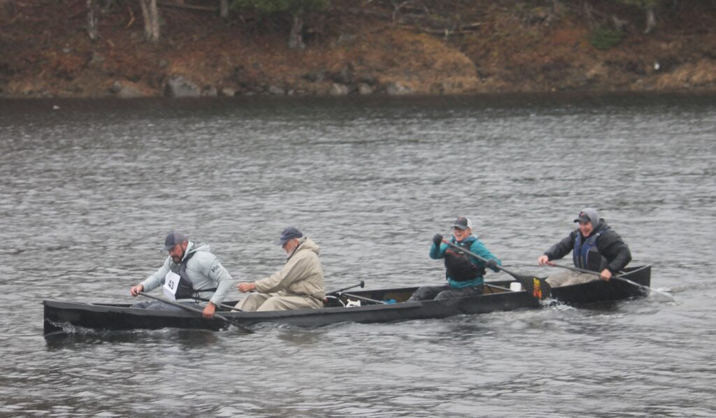 QUICKEST CANOE — The team of Chip Loring, Mark Ranco and Chris and Danielle Francis were the first canoeists to complete the 2025 Dover-Foxcroft Kiwanis Piscataquis River Race, doing so in 56 minutes, 36 seconds.