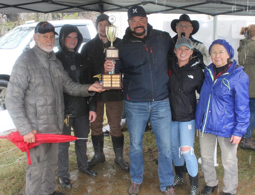 BOB DARLING MEMORIAL TROPHY — Doris Darling, right, presented the Bob Darling Memorial Trophy to the fastest canoes and kayaks in honor of her late husband during the 2025 Dover-Foxcroft Kiwanis Piscataquis River Race as paddlers traveled about 9.5 miles from Guilford to Dover-Foxcroft. The fastest kayak time was Timothy Johnston and Orion Fleming’s 53 minutes, 52 seconds. The fastest canoe was paddled by Chip Loring, Mark Ranco and Chris and Danielle Francis in 56:36.